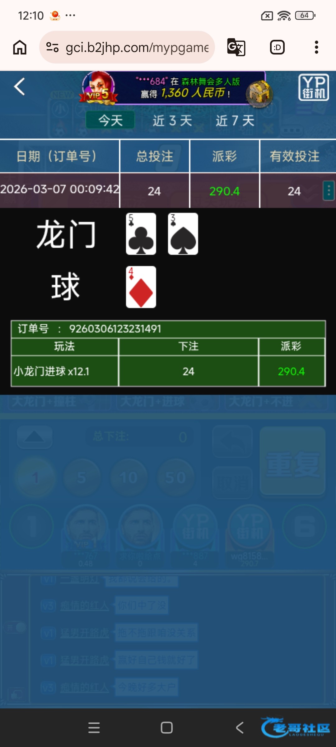 另一个号也是462抢了2块,玩麻一0.2一拉胡中胡中了24块,然后去玩射龙门,24下小进他妈有中了变290。