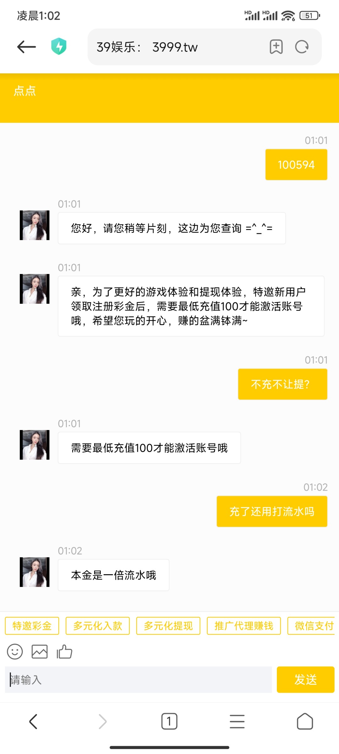 等一天了 没人试试 充一百流水都没打直接提了第一次还秒到
