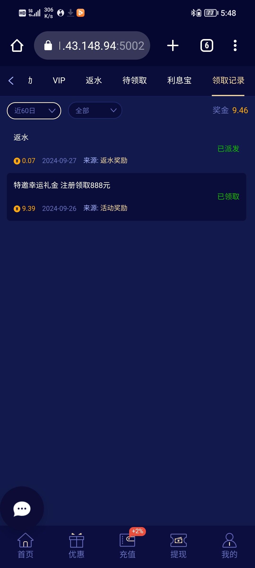 这个野种台真是没救了,我有个号,然后刚刚接了电话,他让我回去领取回归彩金,结果tmd去找在线客服就说让重新注册领取什么新人福利,我操tmd老子手机号都绑定了还怎么重新注册啊?