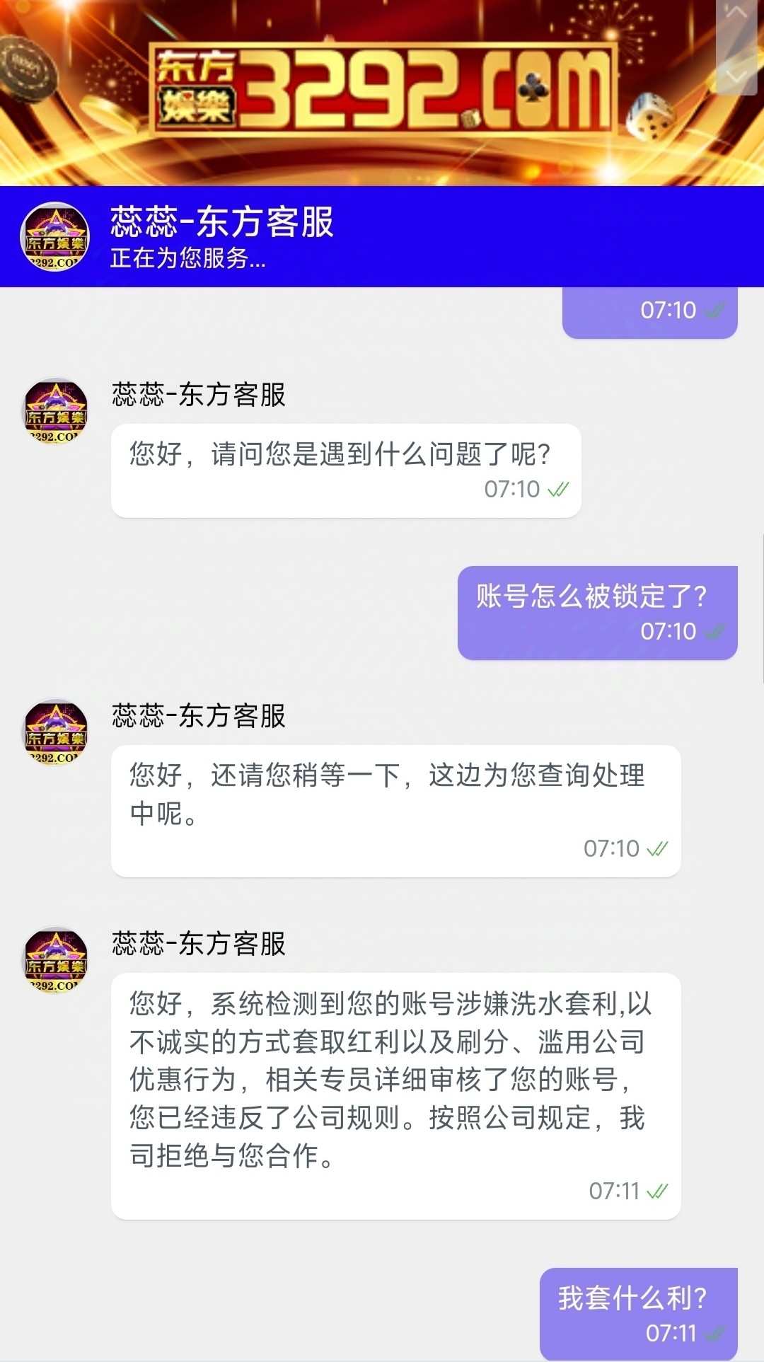 特邀38 第二天送了10块玩麻将拉1.8打上600 后面输到500充了100 后面流水打完 提现怕封号 因为前段时间我朋友在这个上面领38打上1600他没充钱给提了 这种系列的 我怕封号 因为我自己主玩就是这种系列的 所以我充了个100进去 刷了点水我说这种基本就是稳了 没想到把账号给我封禁了 大家避雷吧 能骂客服的就骂 骂了客服的截图 前三个领牛子