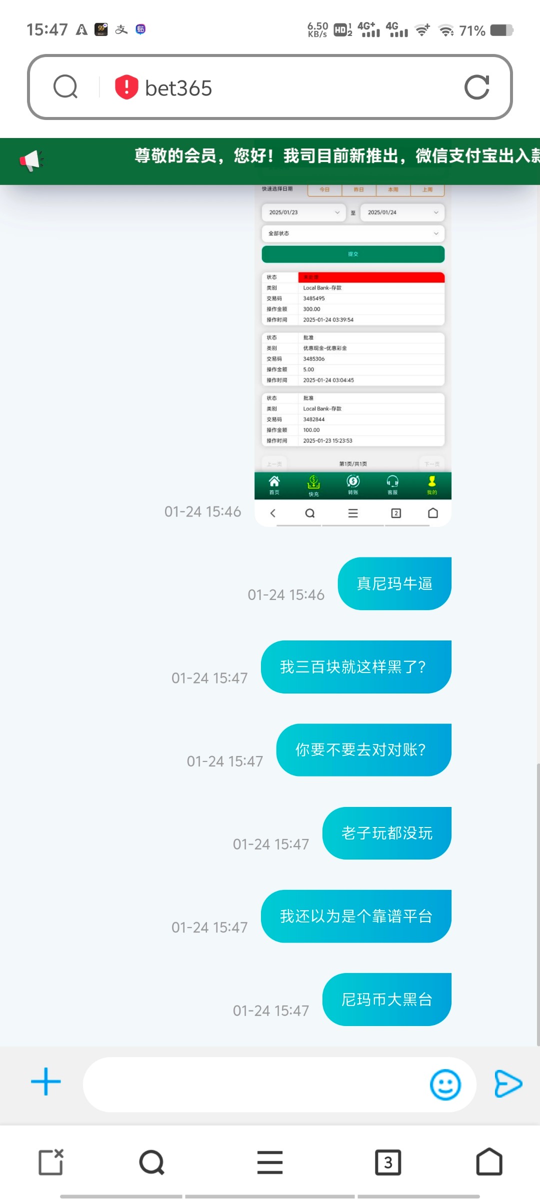 兄弟,我不是说你还有两天过年了,你为什么就要急着充值呢,365tmd不是10年前的365了,我记得十几二十年前365提现慢一点,至少会到账现在屌都不屌你几个平台的客服什么什么阿夏,琳琳,1056.1336.反正好几个网这些客服都是一起的