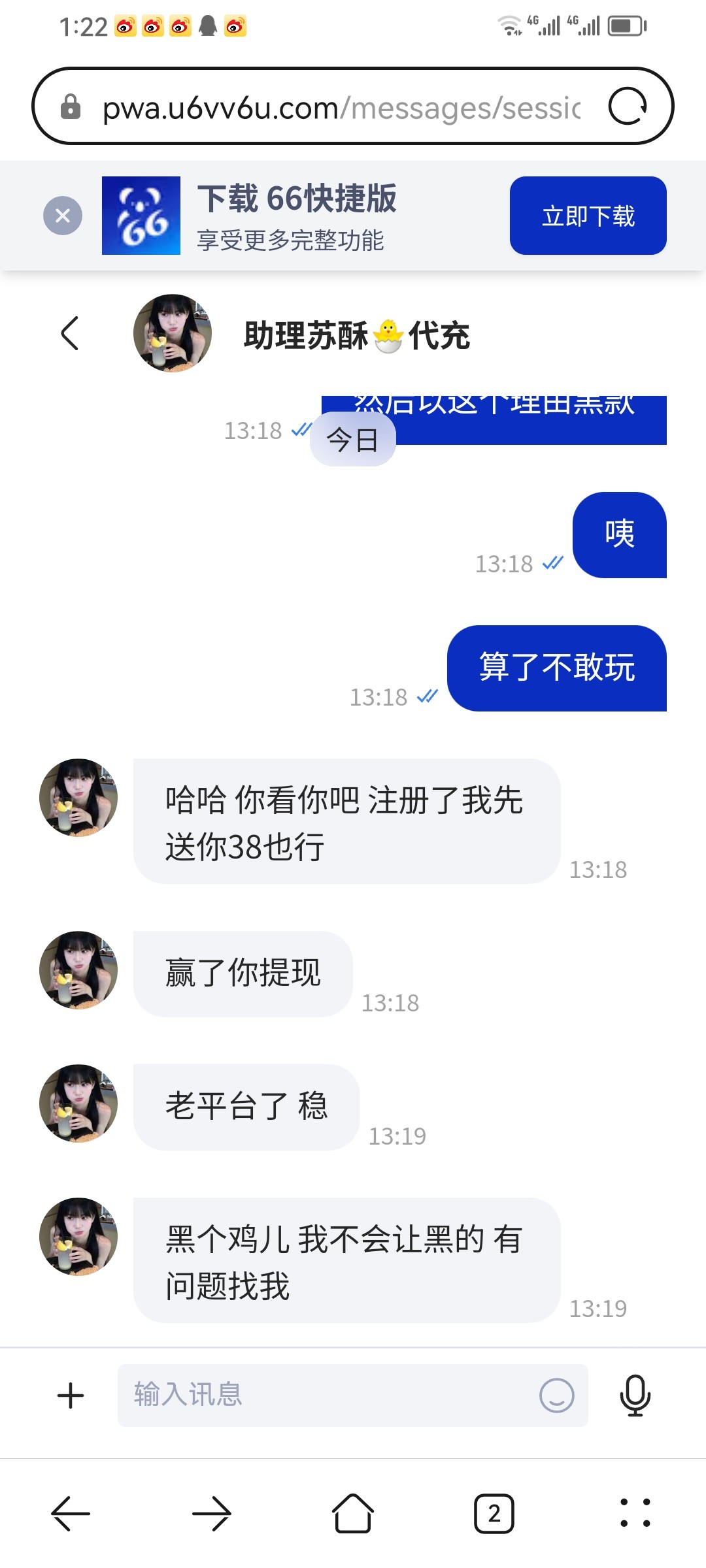 https://m.zczb66.com/ 进直播间,然后下载66 APP 联系代理注册 我打出来300,然后把我的号给封了