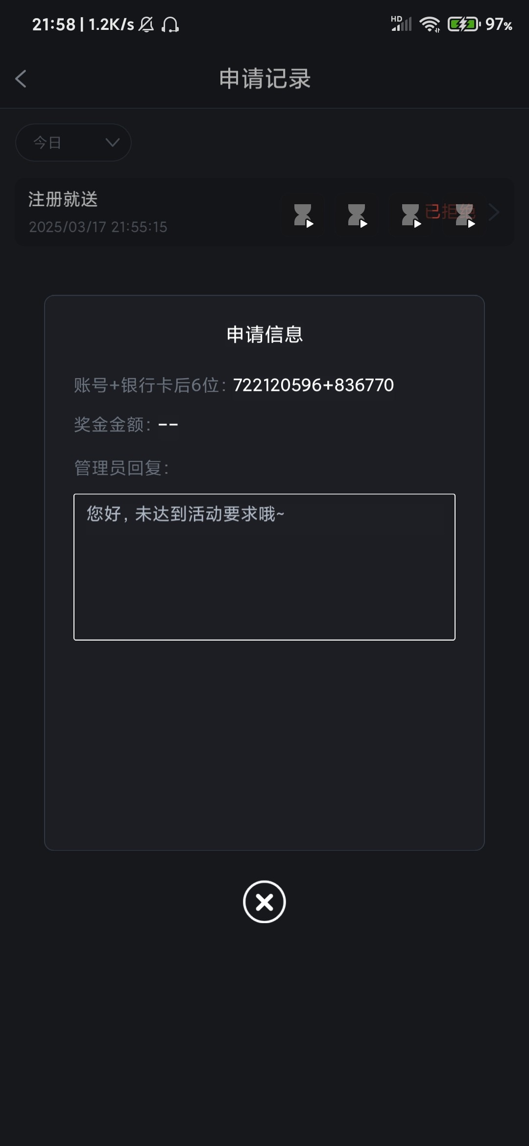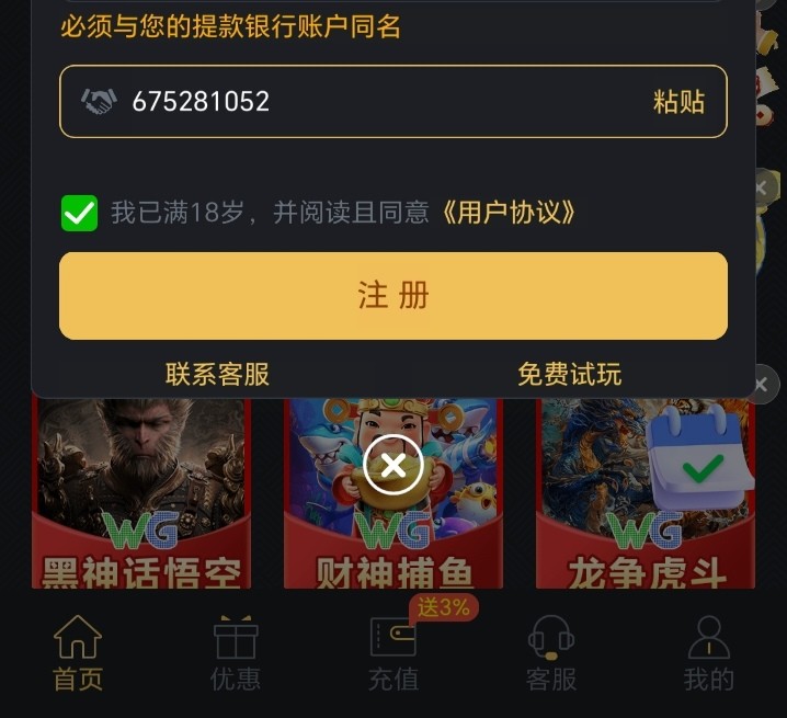 充值申请也是秒拒,问狗杂种客服,说不是app申请的,我说就是APP申请的,后来又改口说不是APP注册的,反正一直重复说这一句话,活动里说注册帐号,下载登陆,那狗东西野鸡台就是忽悠充值不给送