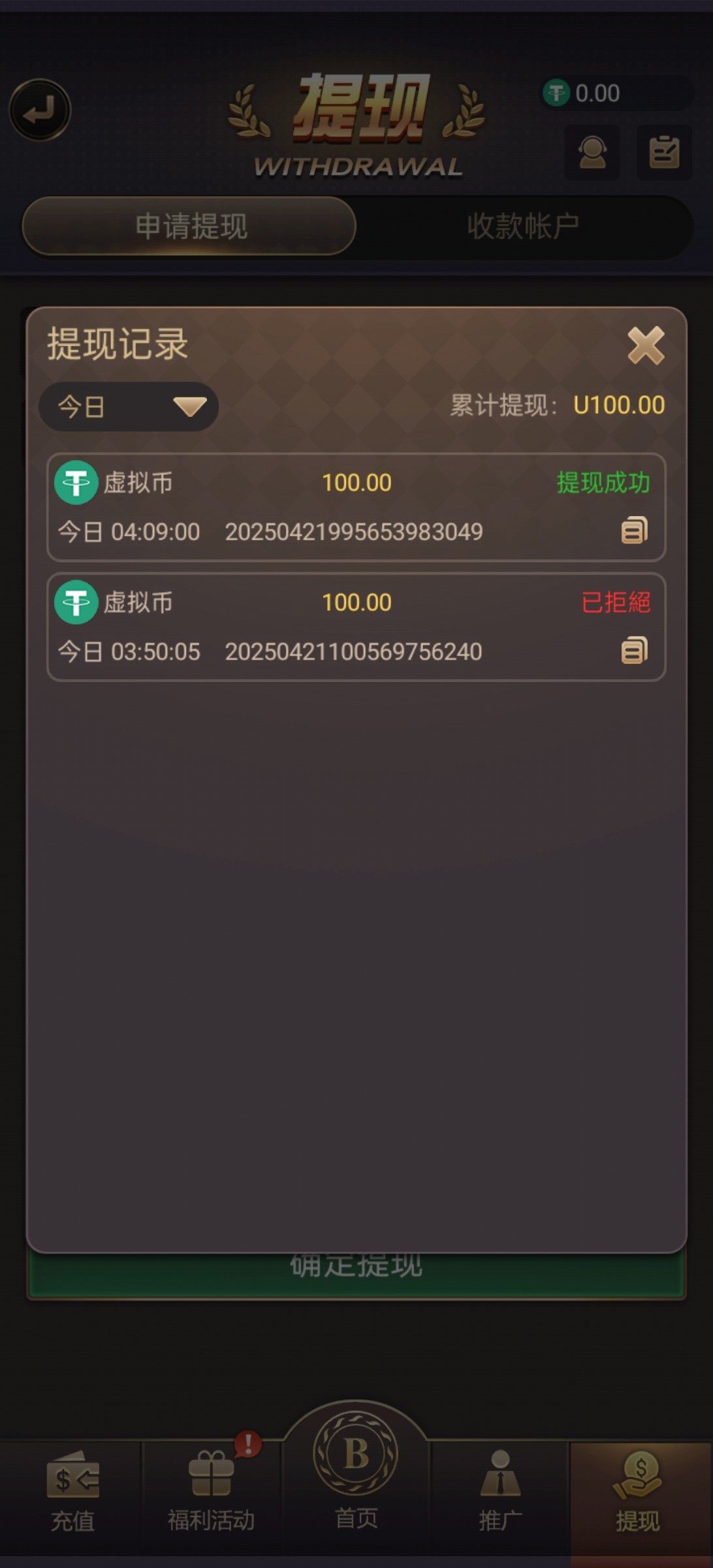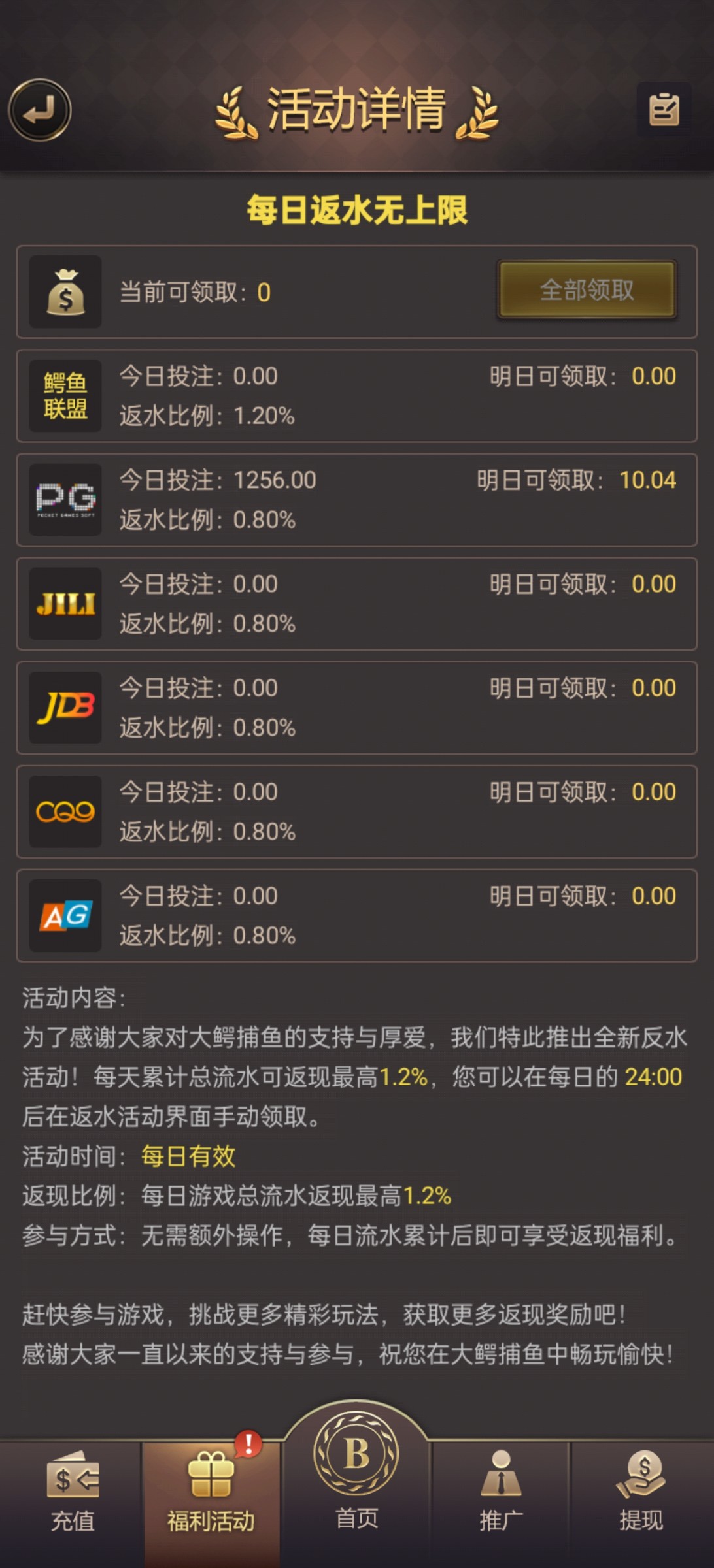 昨天领取了18.88u没打上今天1.2反水打上了700u下了100u明天还有10u反水