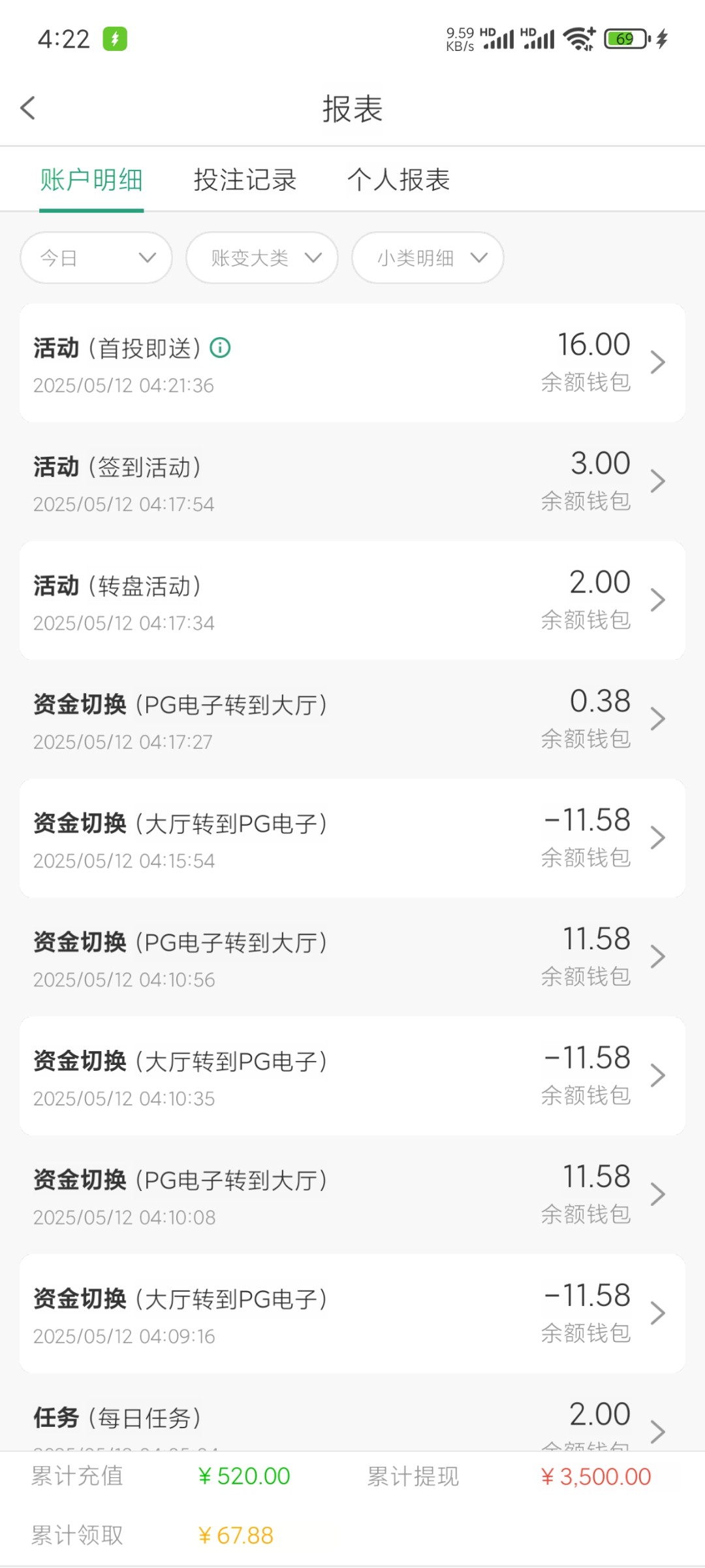领了18+16上来就打到400打了200多流水上五百多了。