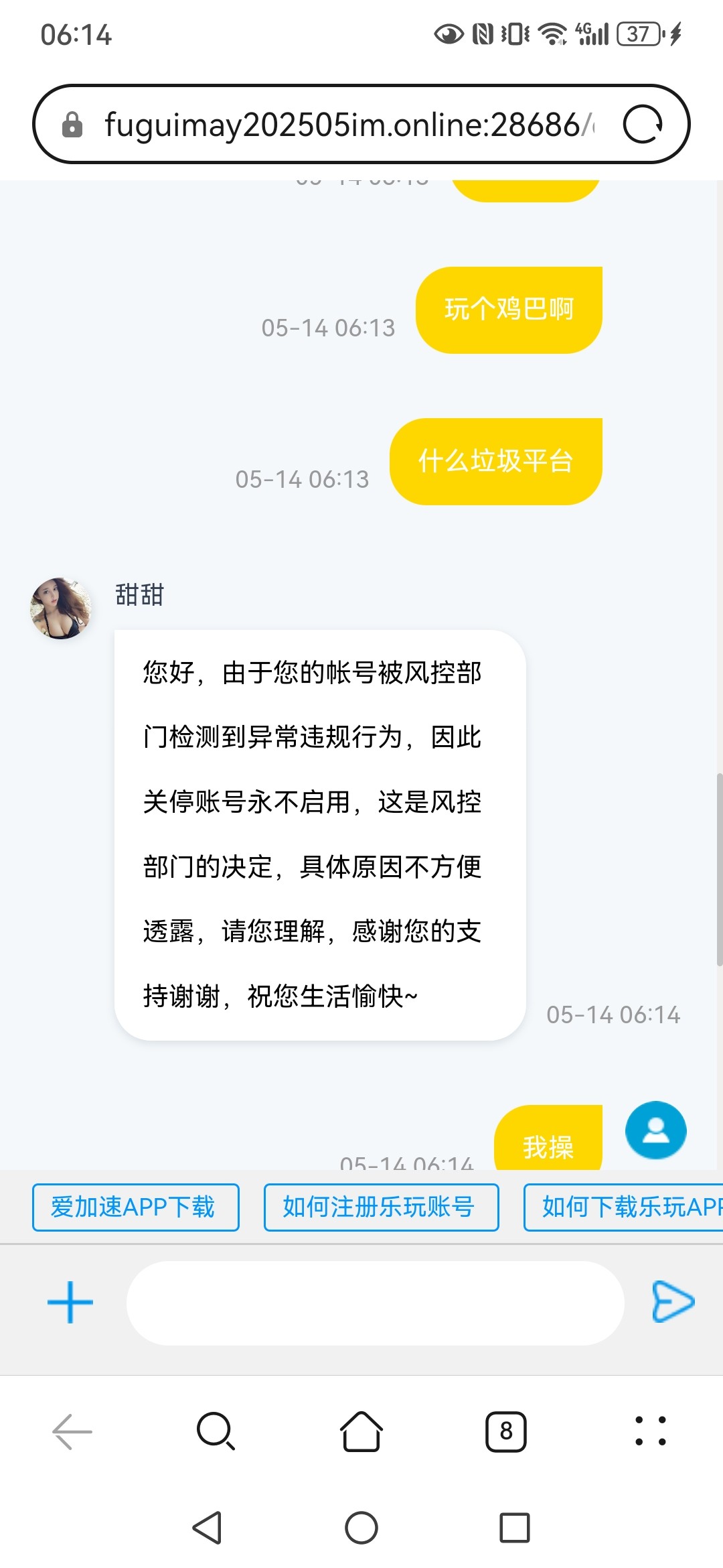 求求你们不要再发乐玩了,充值73,打到230提款冻结账号,说违规。根本没有申请活动。提款就黑,气到我吐血