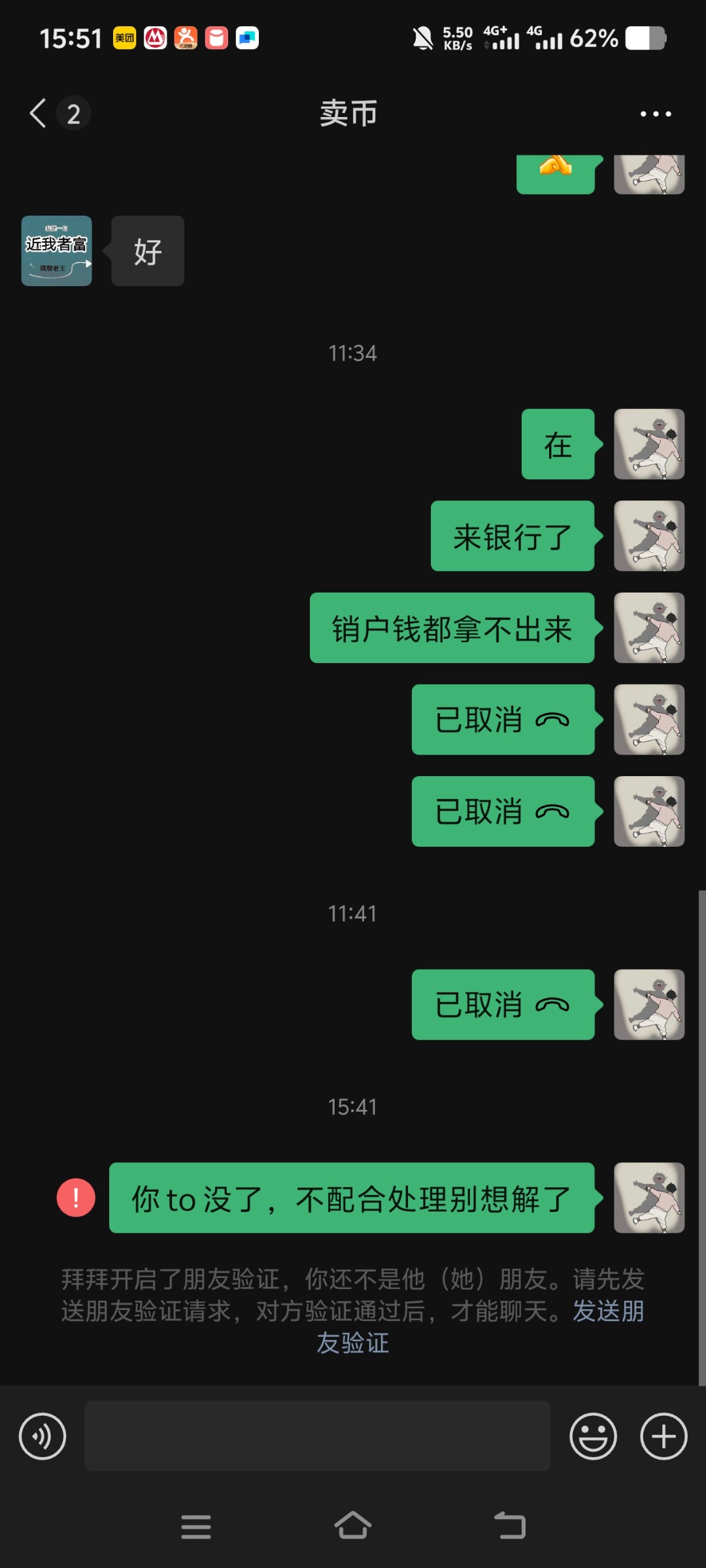 加微信是银行卡冻结后,他找客服给我联系方式,让我放币,微信实名也对得上,害也是难搞