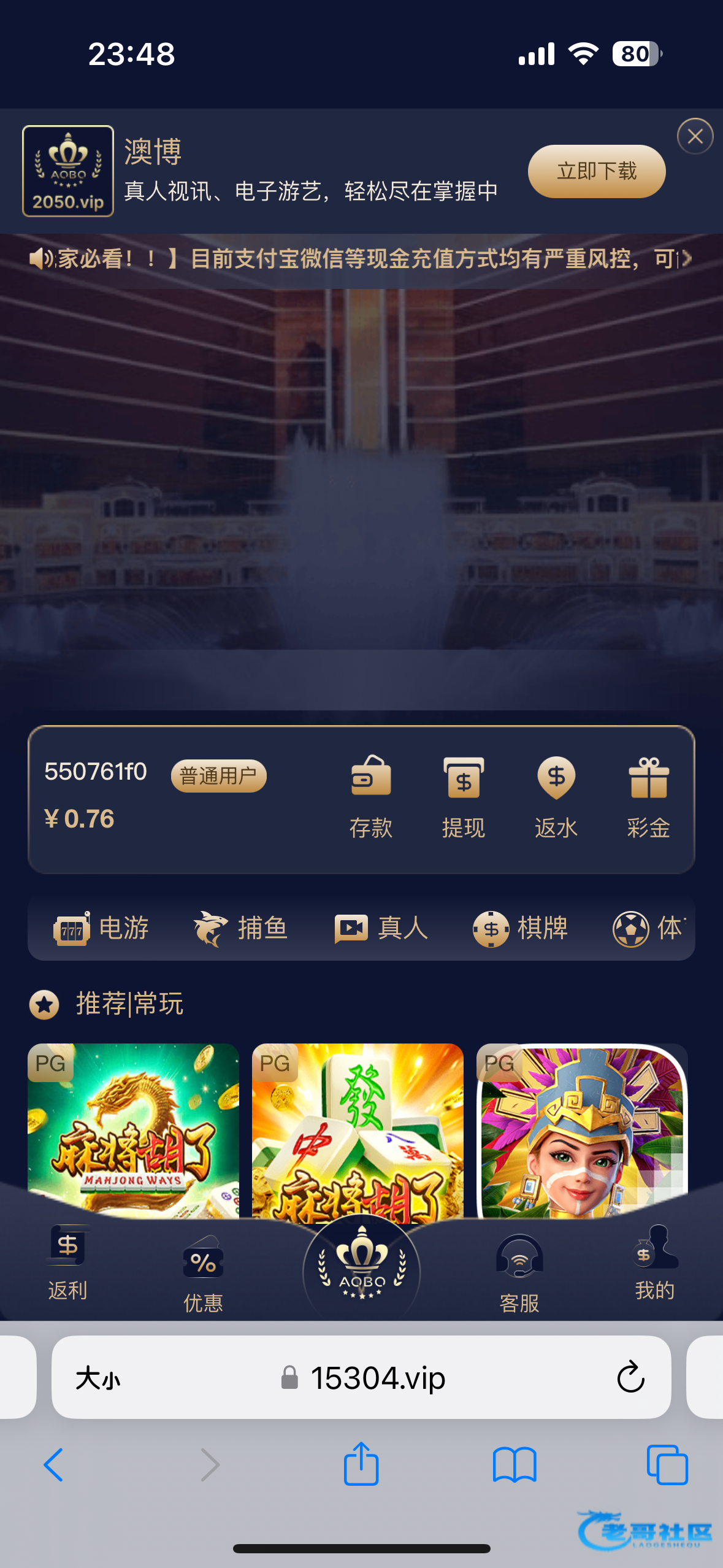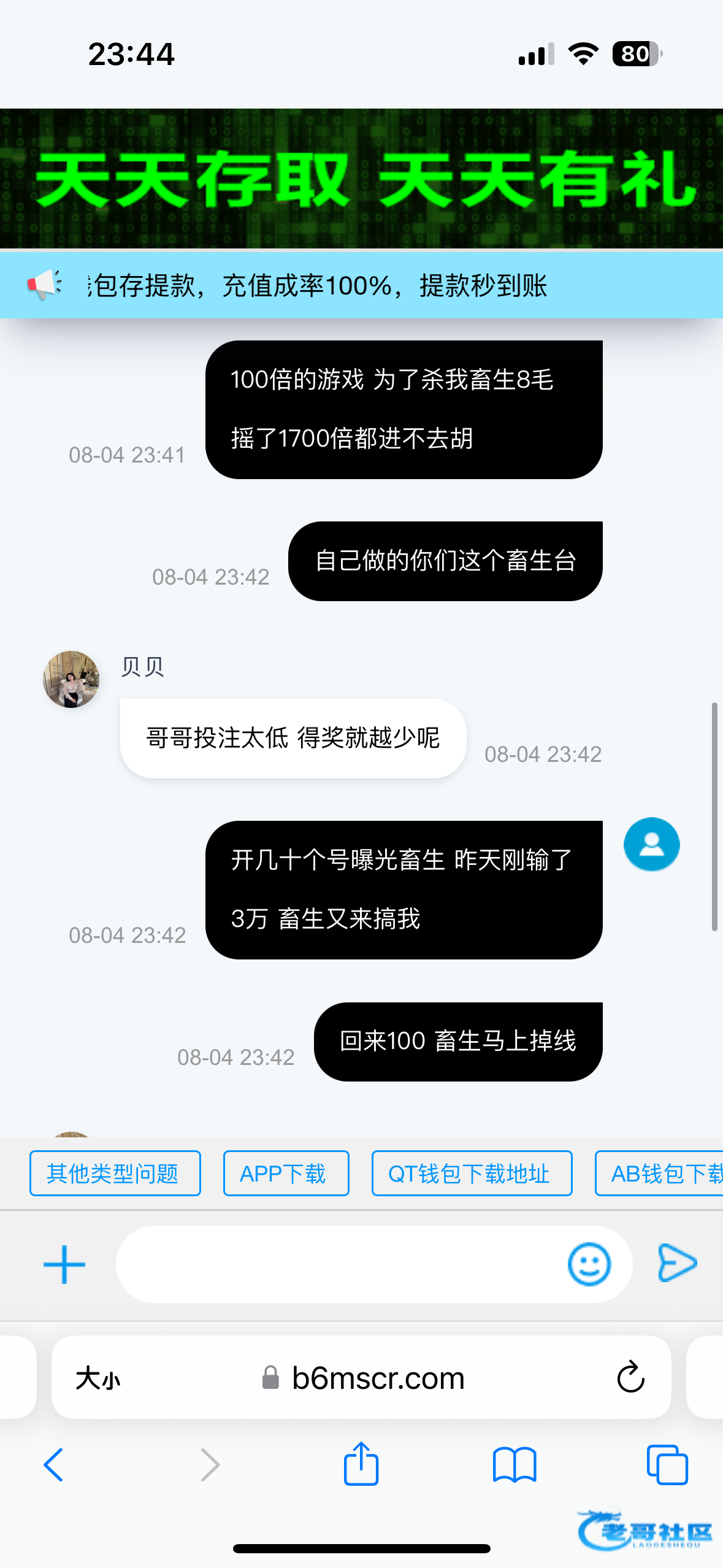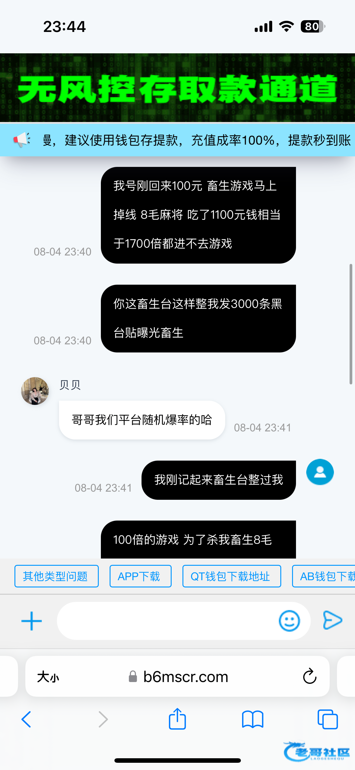 这个畜生台3月份时来了一次特邀500+500 10倍水 刚打1000流水就输光 自己做的游戏 今天又来一次特邀又存500+500 8毛麻将进去回来了100元钱 刚回来就掉线 掉线后进去游戏杀了1700都进不去一次胡