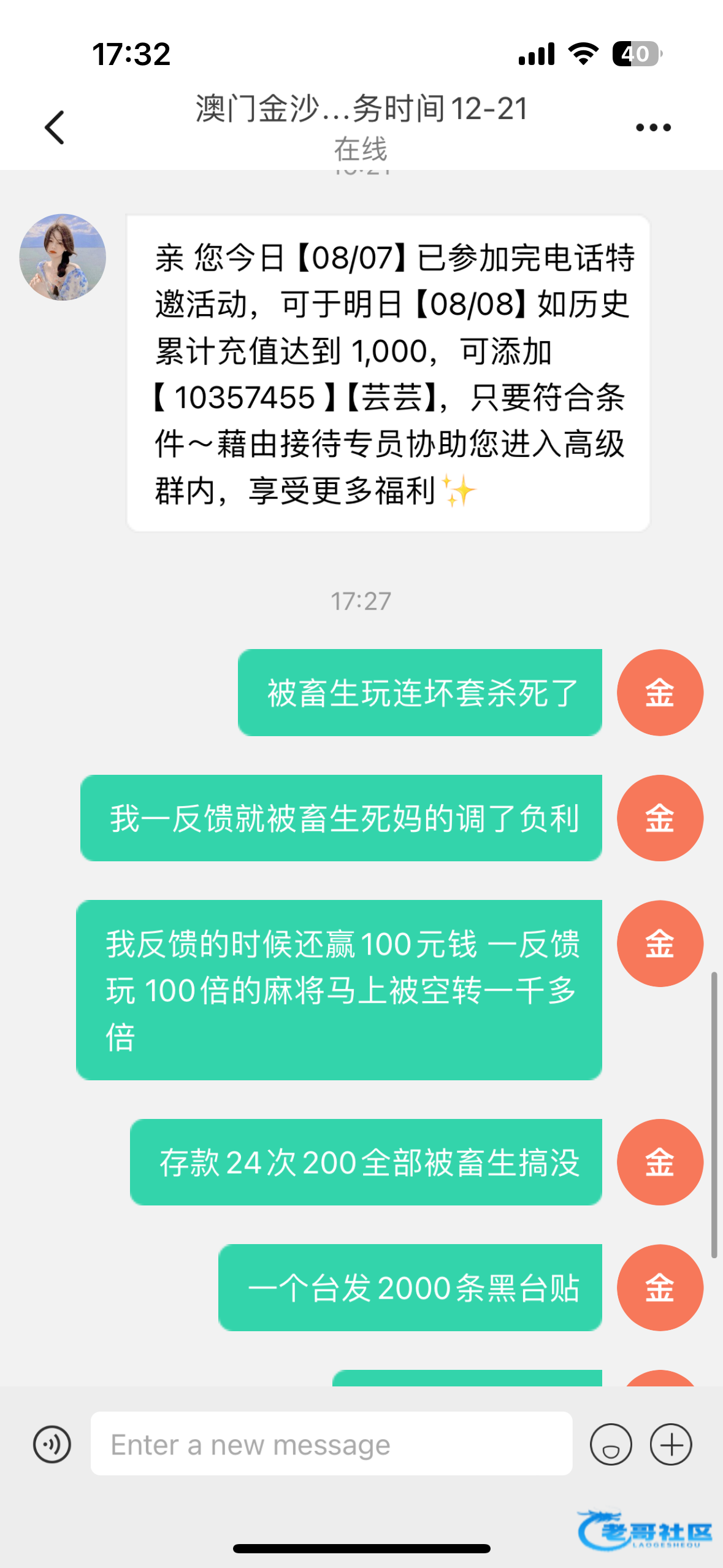 @狗庄亲爹 ,这群畜生台都是一伙的只要你有一个台赢钱 第二个台马上来电话洗走 输多了又给回来一半 回来一半后他们公司的台又来特邀 这几年就是被这几个畜生台搞了几万元