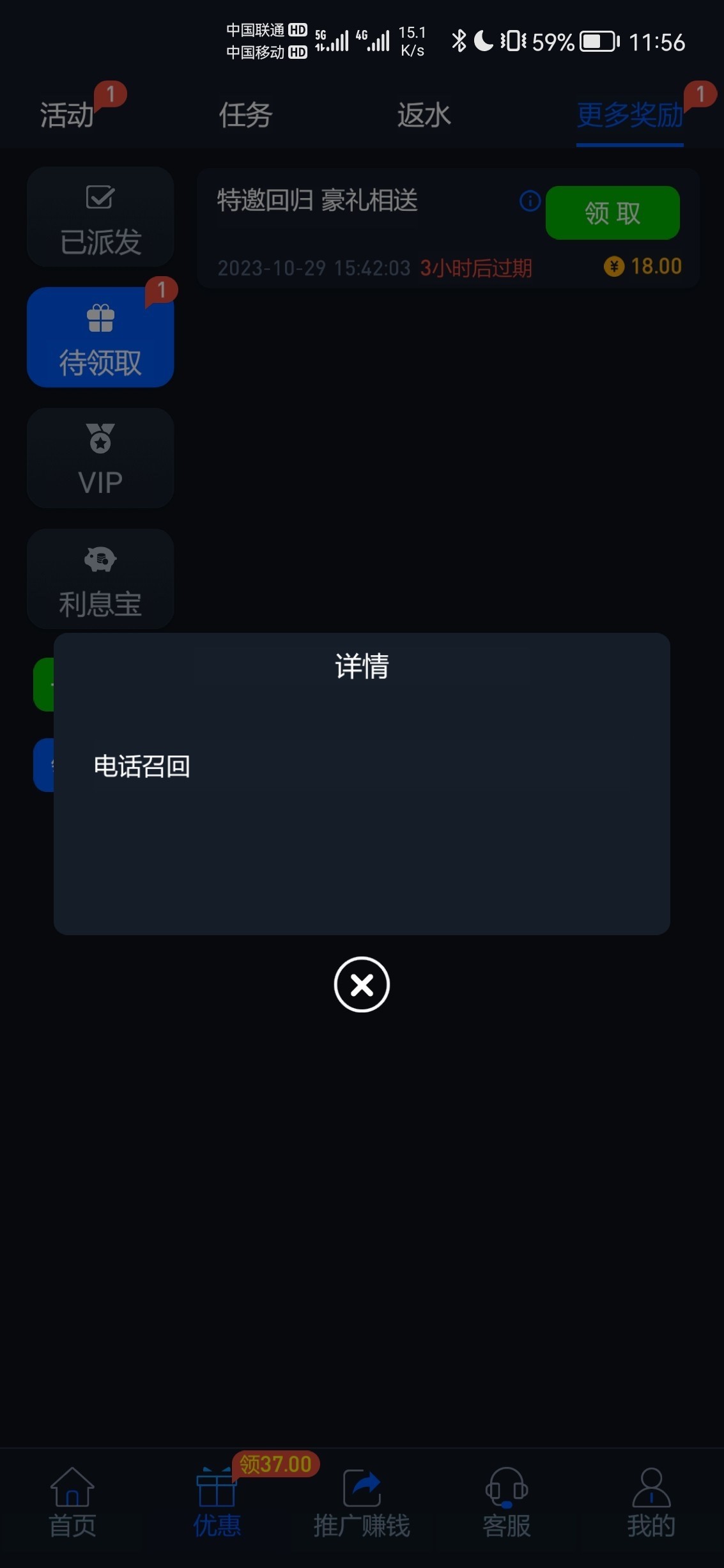 电话回馈18,优惠任务里面领, 估计是要充值的,三个月前在这平台充了100 上号看看有没有吧