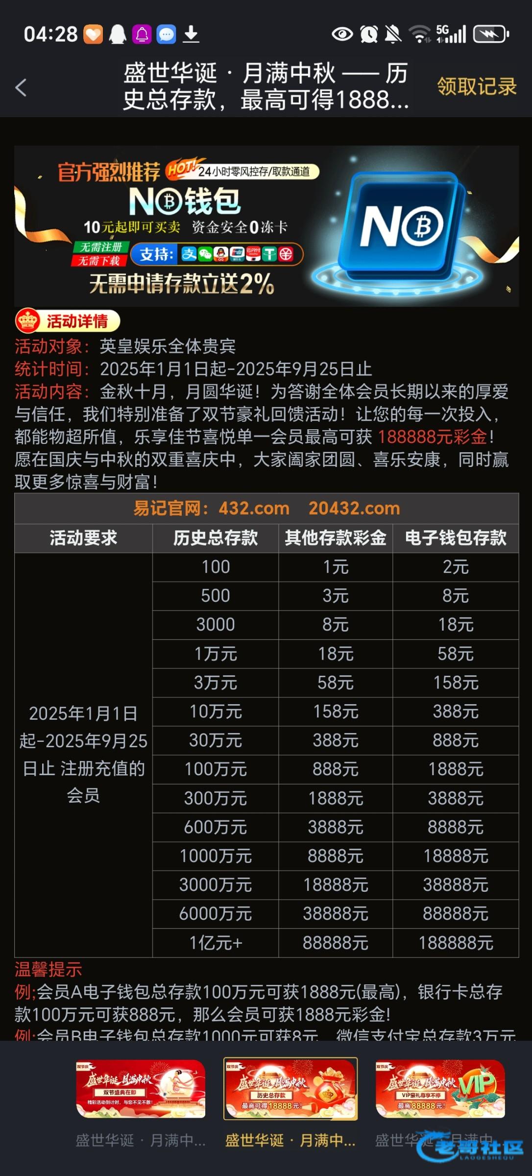 详情如图 总存款回馈老哥们记得领链接:432.com