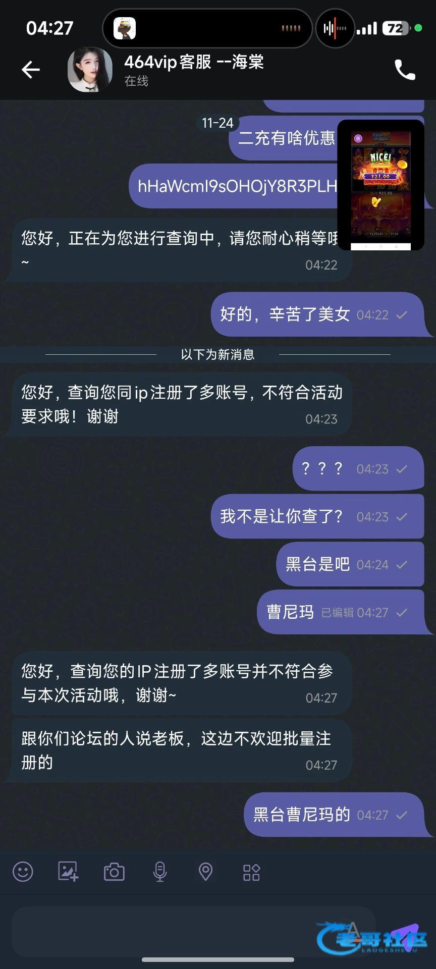 刚刚看到有老哥发这个帖子,说首单包赔,说他也申请到了,然后就去注册申请了,第1次注册这个平台,第1次注册这个钱包,然后垫子一点水都没有,几分钟就拉完了,去找客服说申请包赔,他查半天,后面直接说多ip,让他说账号他又说不出来,一直说多ip,给老哥们避一下坑
