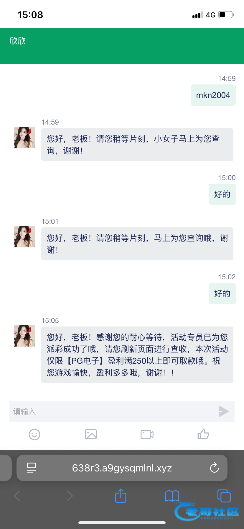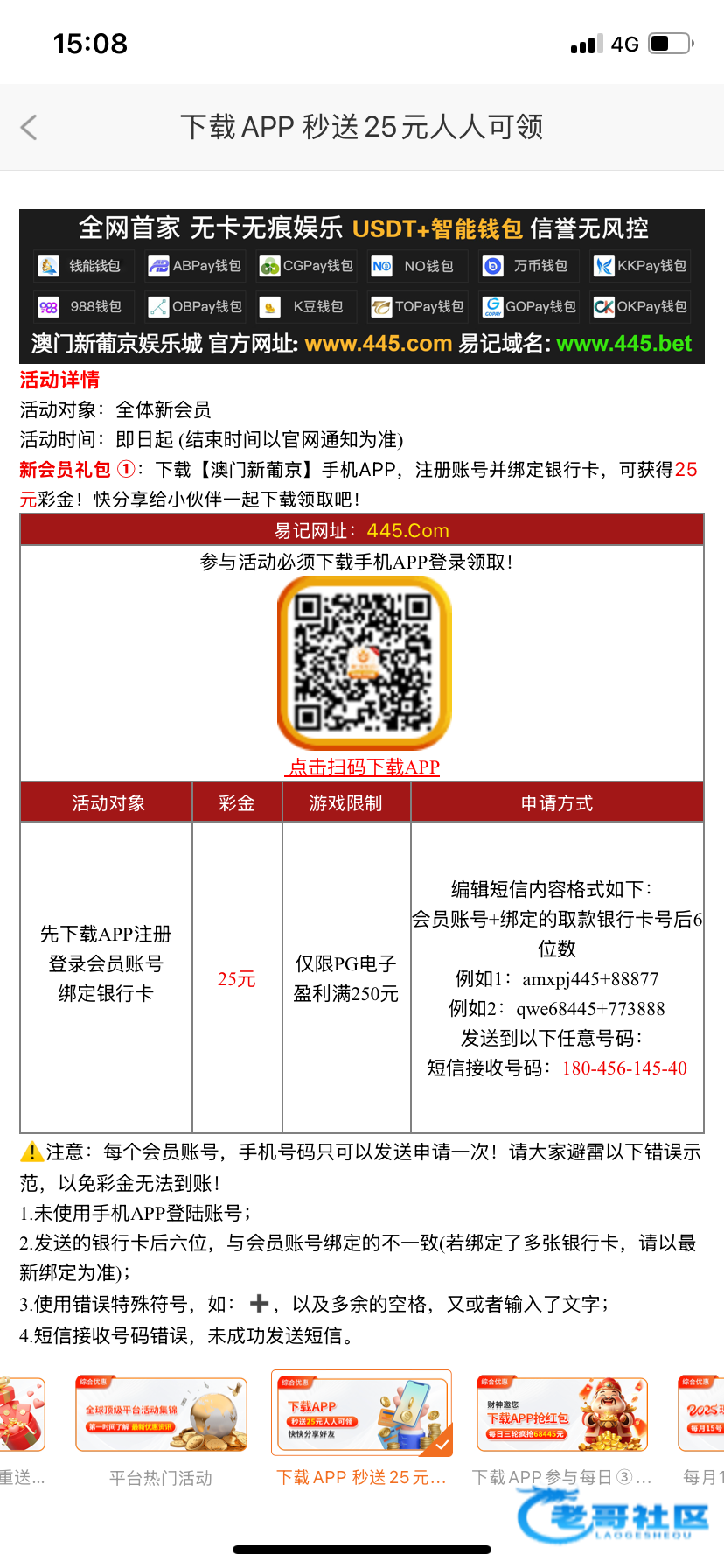 发送短信送25国内号码,没有到账找客服补,提款黑不黑不知道,没打出来链接445.com