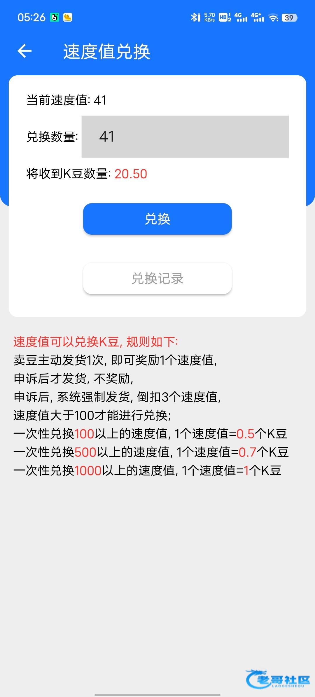 进人K豆钱包点击我的→点击最上面自己的账号→最下面的速度值兑换即可